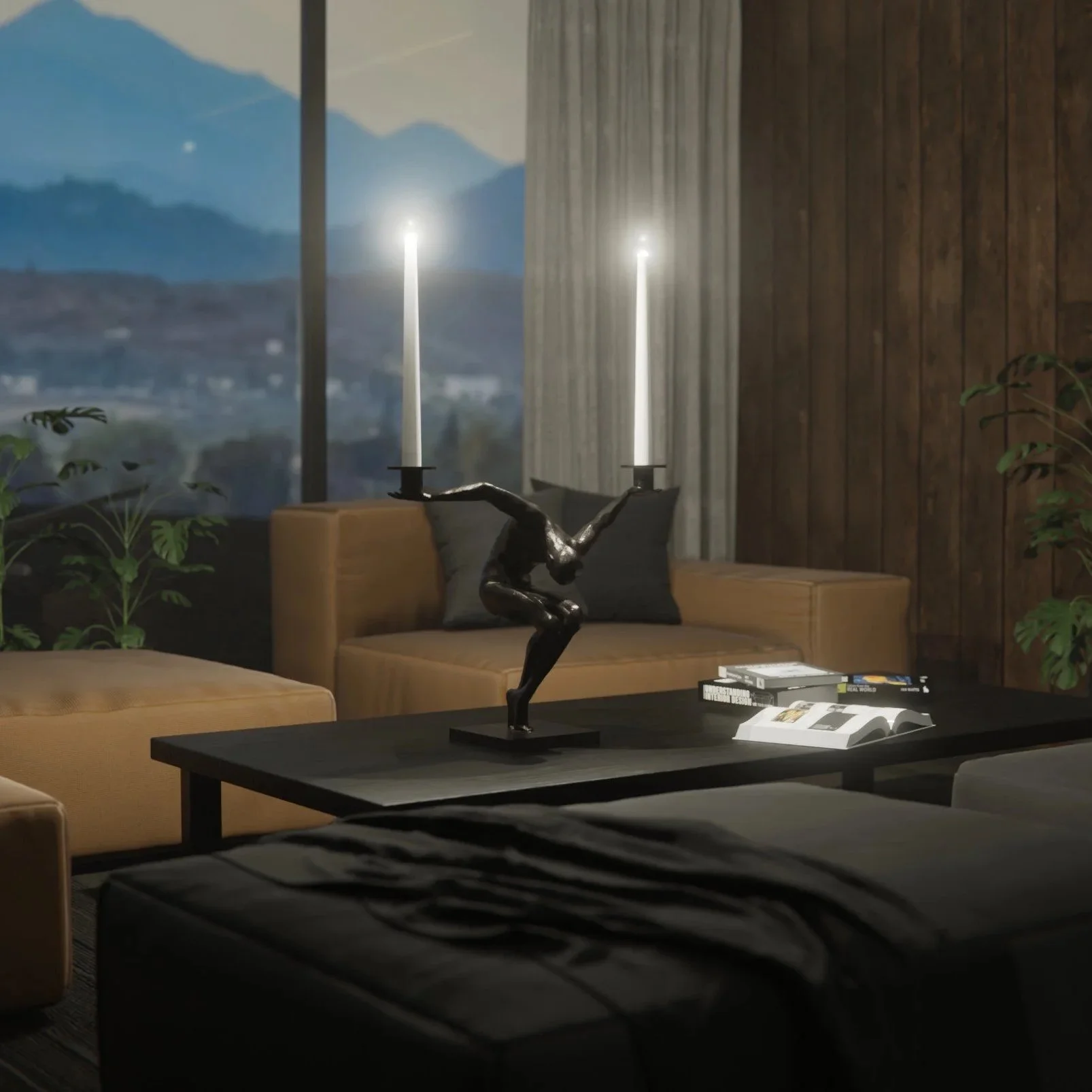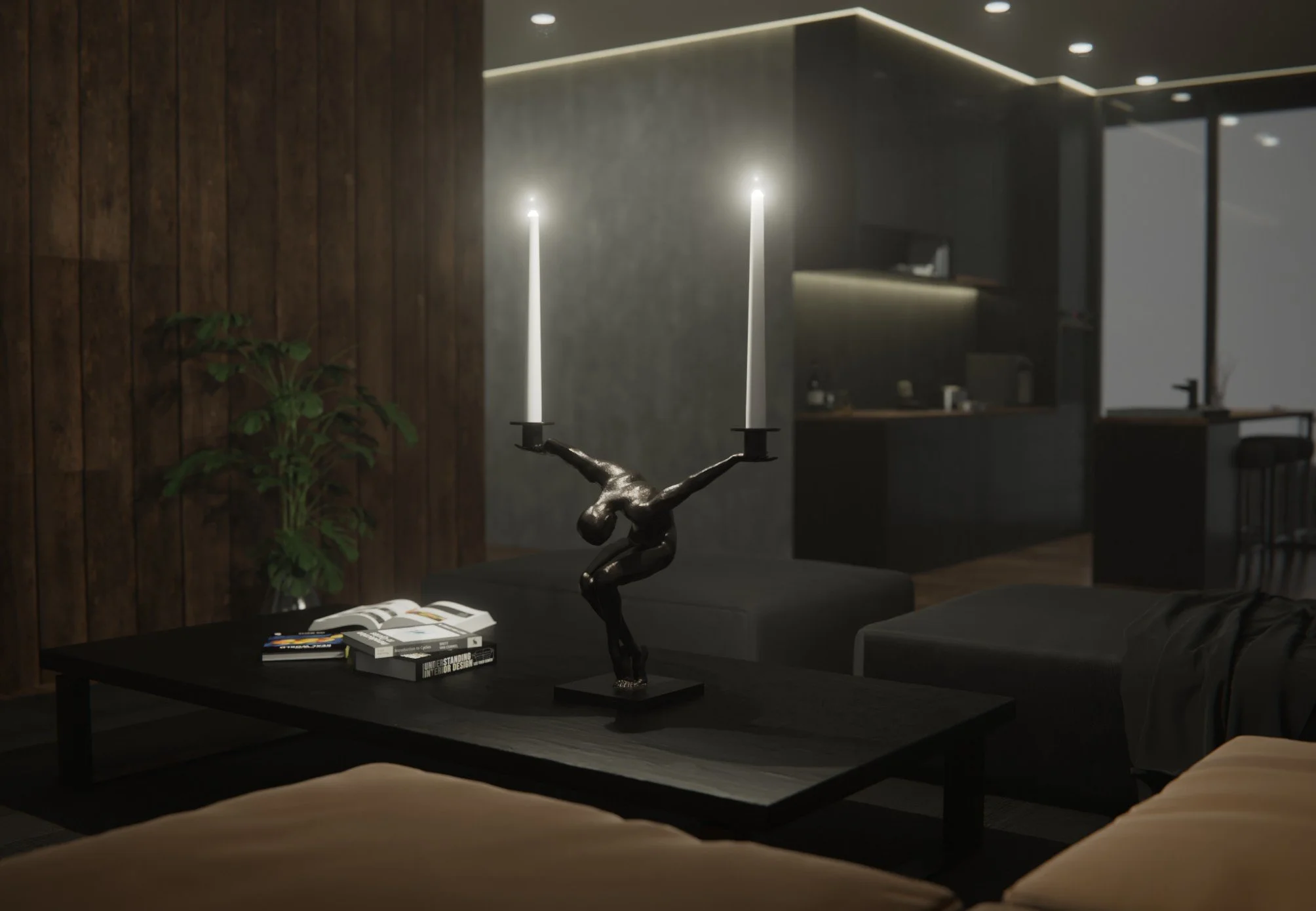 The light does not simply illuminate the sculpture—it completes it. The work asks for your participation: to light the candle, to pause, to stay. As the flame burns, shadows move slowly across the body. Through this shifting light, time becomes visible and space is gently transformed. The bronze changes with the moment, and the figure feels momentarily alive.