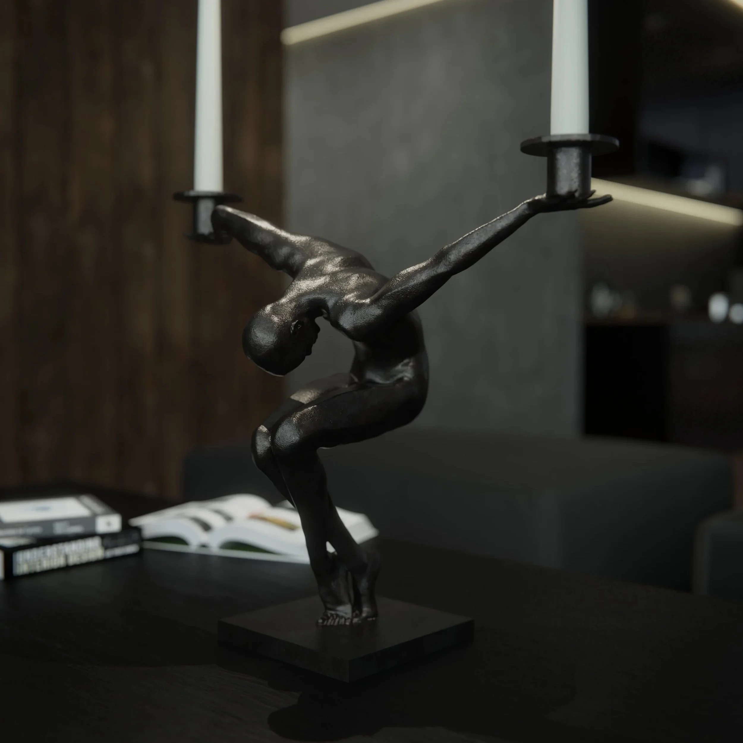 The sculpture Between Light balances on its toes, leaning forward, arms extended — offering light. The body is tense yet gentle, caught between effort and grace. Each hand holds a candle, and the flame becomes part of the gesture: an extension of attention, care, and presence.
